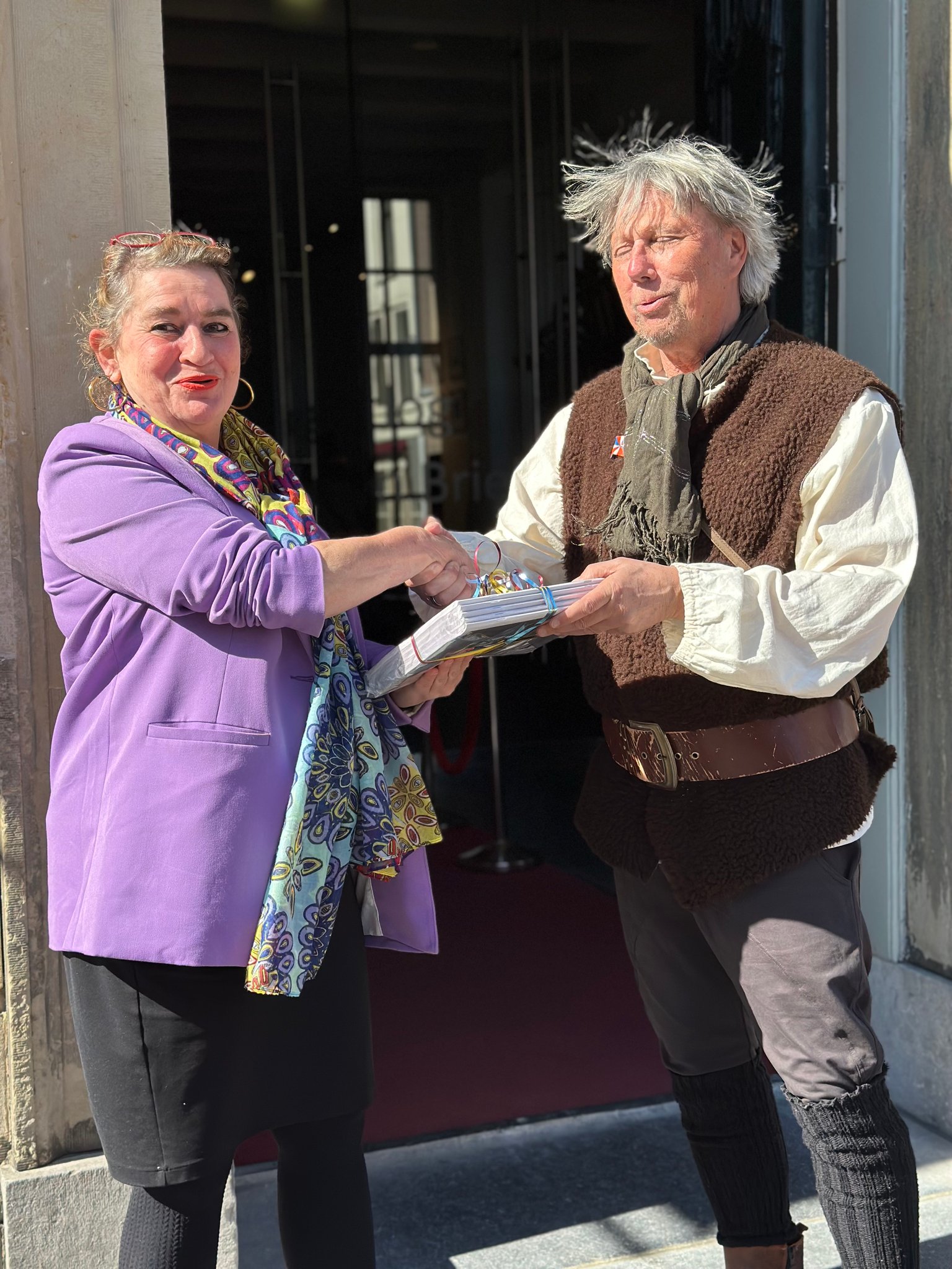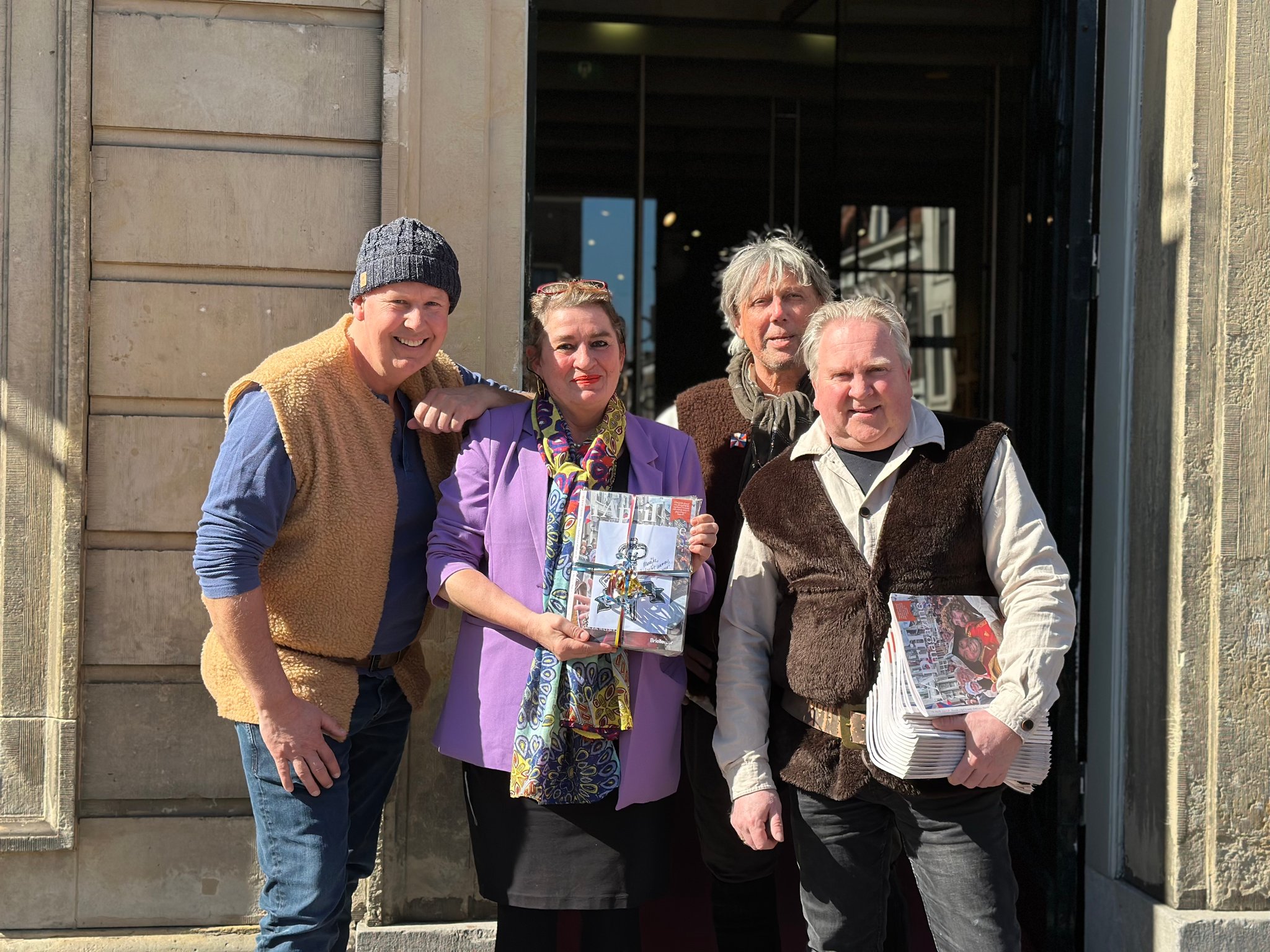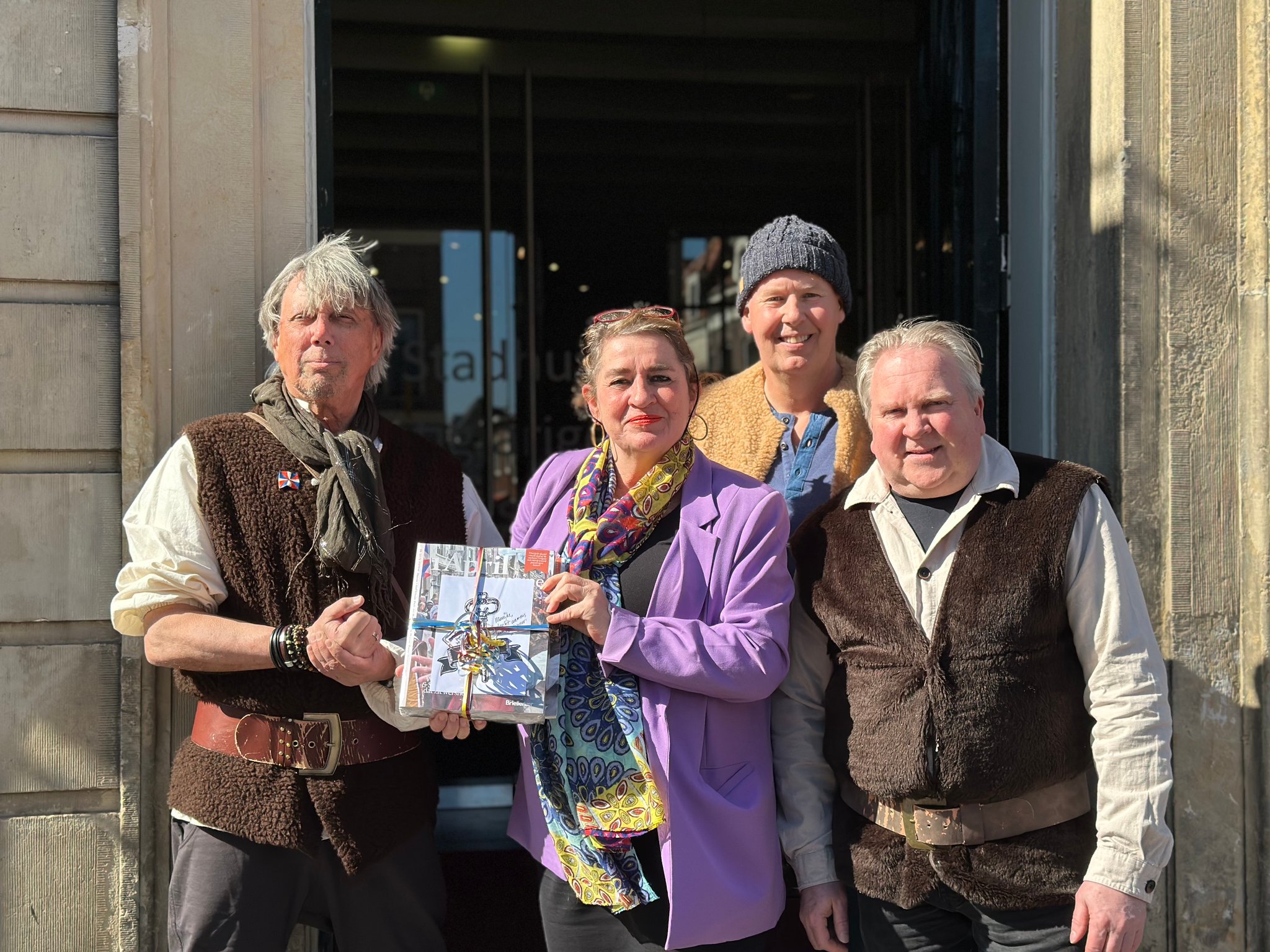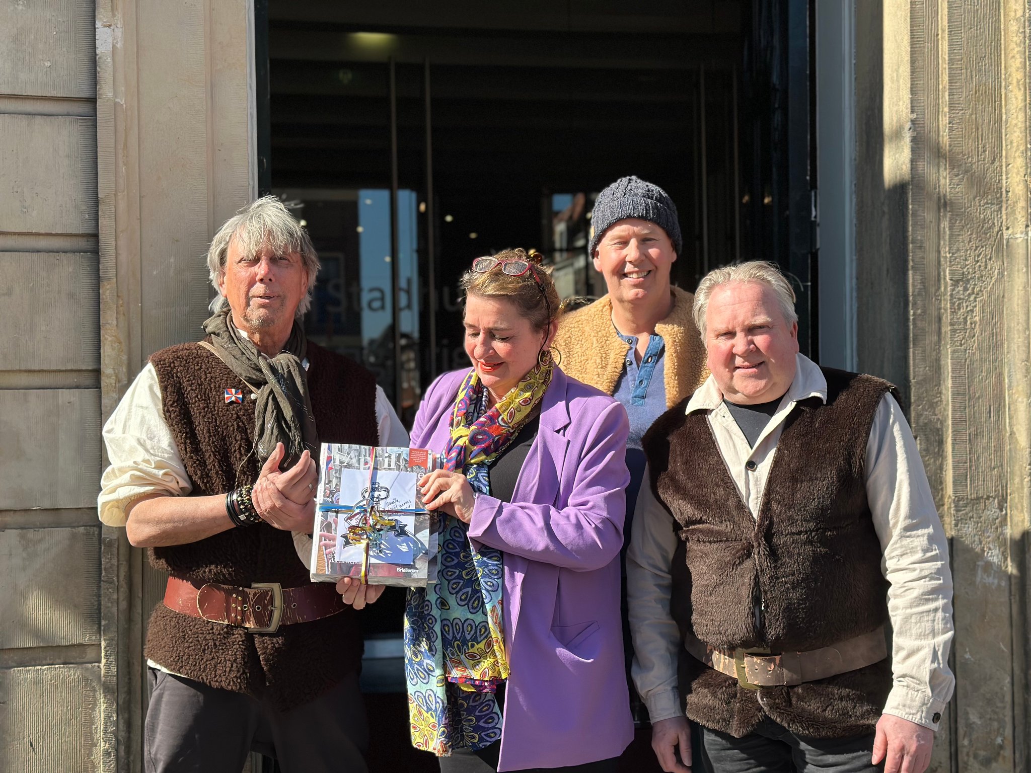 BRIELLE – Het eerste exemplaar van het meer dan 100 pagina’s tellende 1 April magazine uitgegeven door Bastion X werd deze week overhandigd aan directeur Marijke Holtrop van het Historisch Museum Den Briel. Het Bastion X-team bestaande uit Dennis van der Zalm, Jerry de Jong en Gary van der Stoep had zich voor deze bijzondere gelegenheid op het bordes van het oude stadhuis in Brielle alvast in 1-aprilpak gestoken. Marijke Holtrop nam het fraai ogende blad met veel foto’s , boeiende verhalen en interviews graag in ontvangst. ‘Een geweldige aanwinst en ook heel goed dat dit magazine in heel Voorne aan Zee bezorgd wordt’, aldus de museumdirecteur.