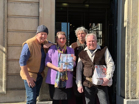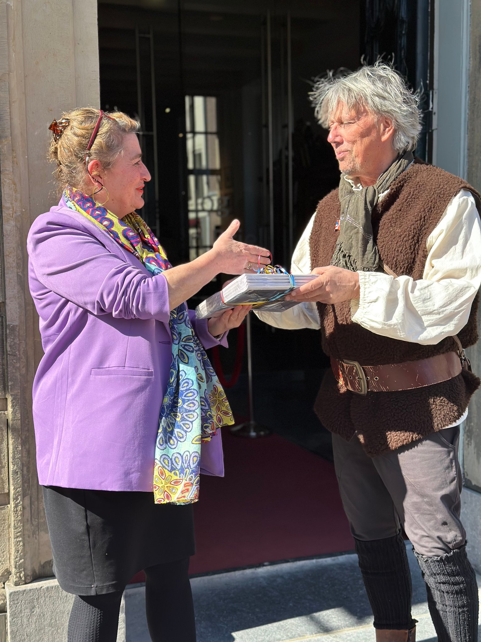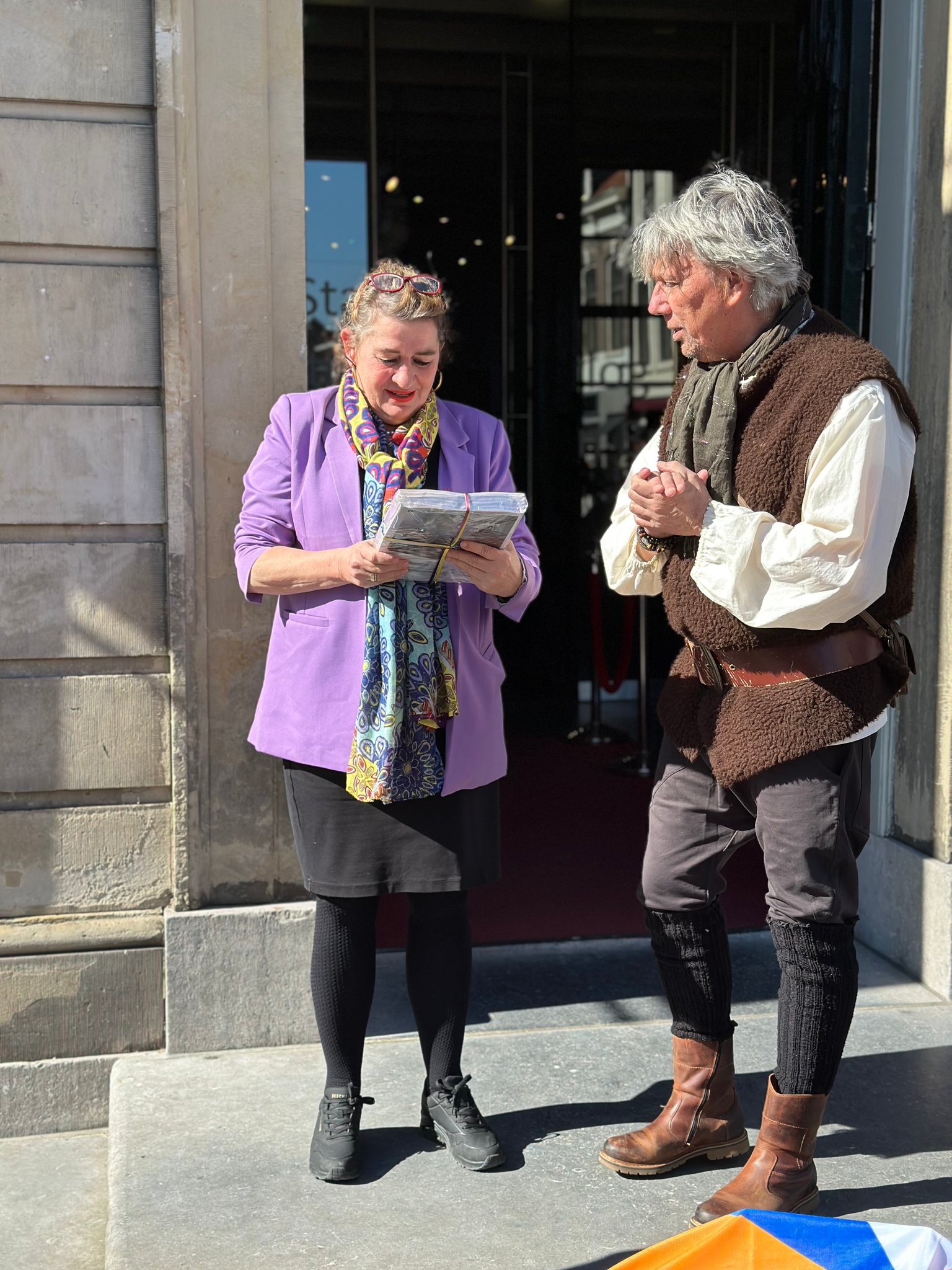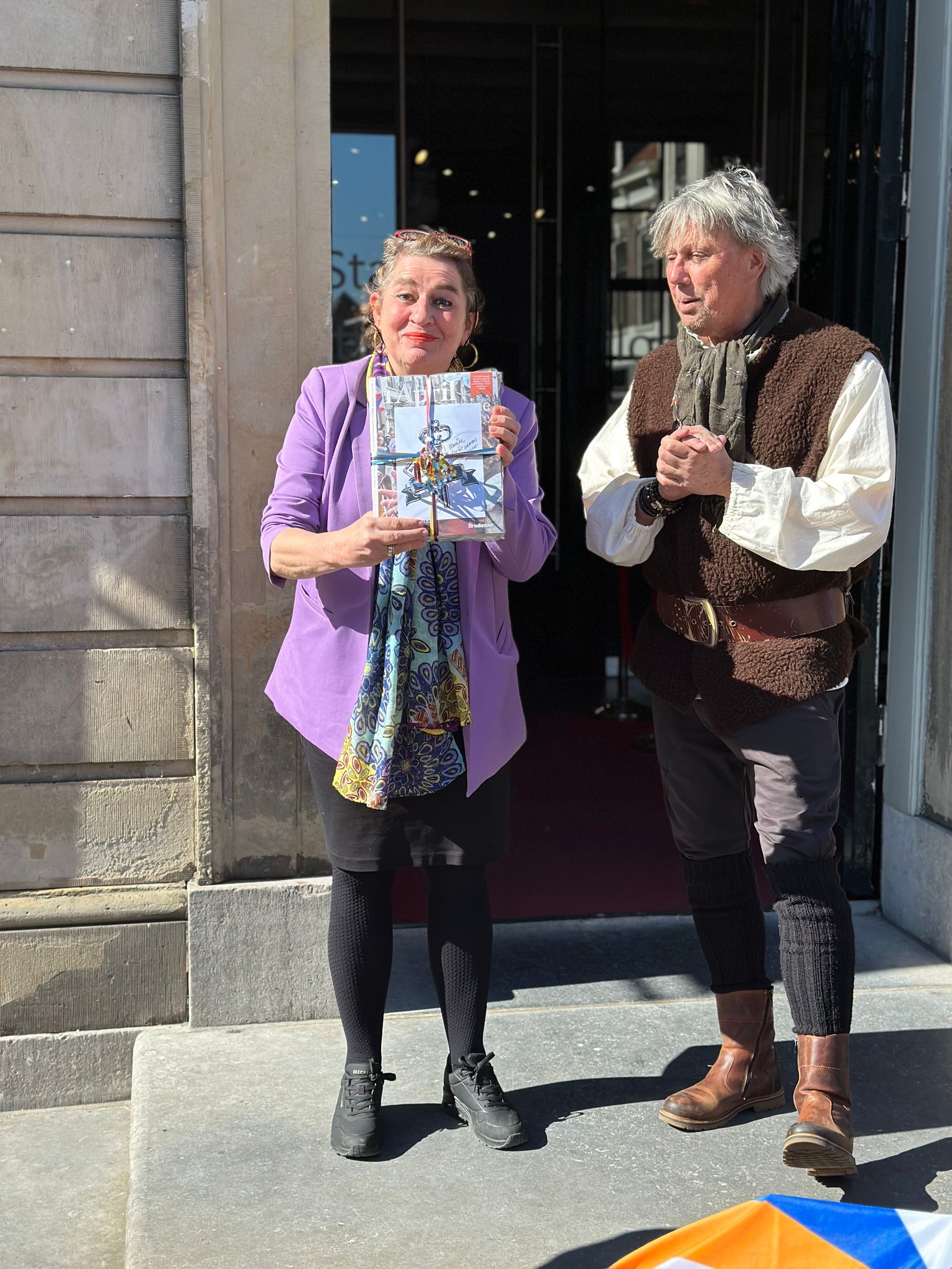 BRIELLE – Het eerste exemplaar van het meer dan 100 pagina’s tellende 1 April magazine uitgegeven door Bastion X werd deze week overhandigd aan directeur Marijke Holtrop van het Historisch Museum Den Briel. Het Bastion X-team bestaande uit Dennis van der Zalm, Jerry de Jong en Gary van der Stoep had zich voor deze bijzondere gelegenheid op het bordes van het oude stadhuis in Brielle alvast in 1-aprilpak gestoken. Marijke Holtrop nam het fraai ogende blad met veel foto’s , boeiende verhalen en interviews graag in ontvangst. ‘Een geweldige aanwinst en ook heel goed dat dit magazine in heel Voorne aan Zee bezorgd wordt’, aldus de museumdirecteur.